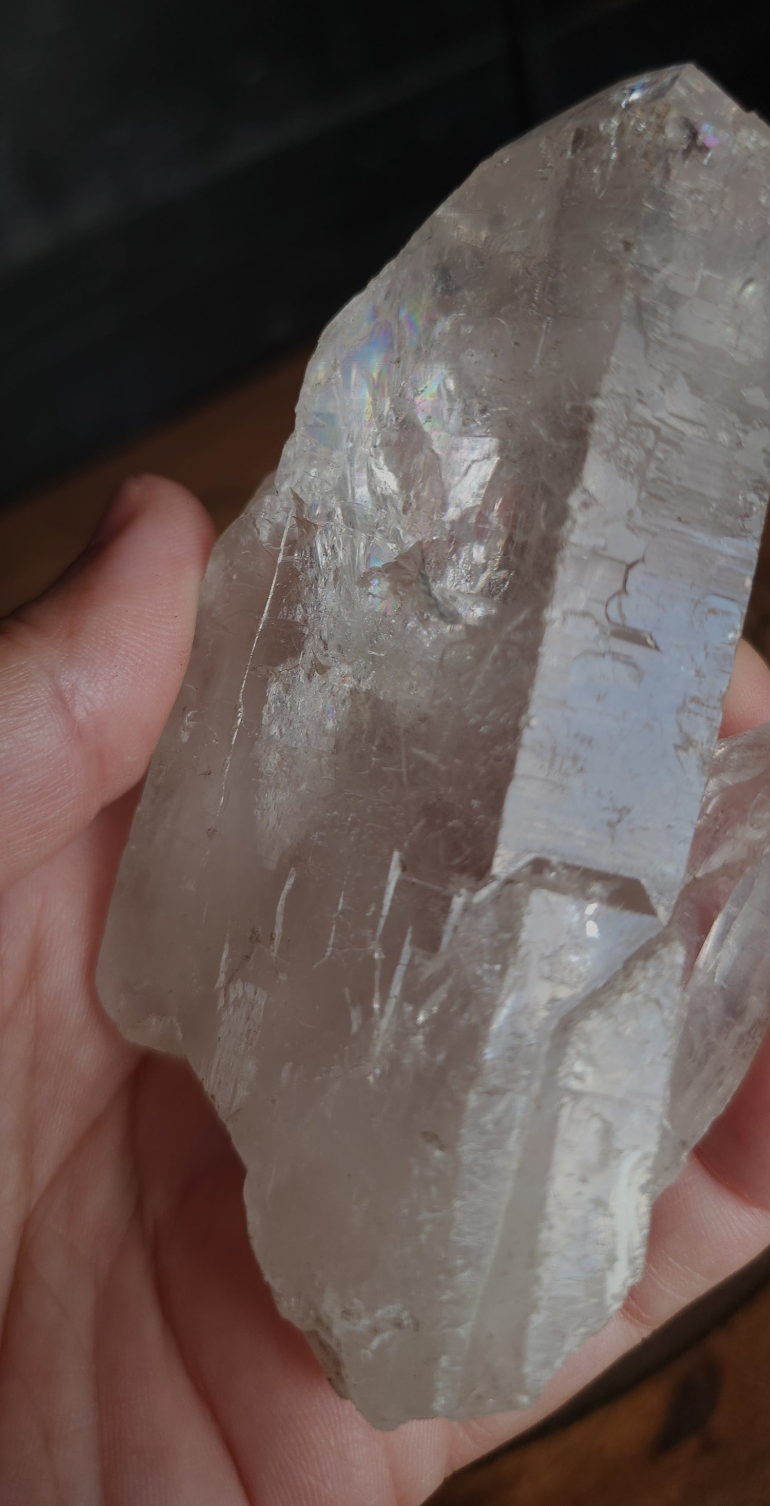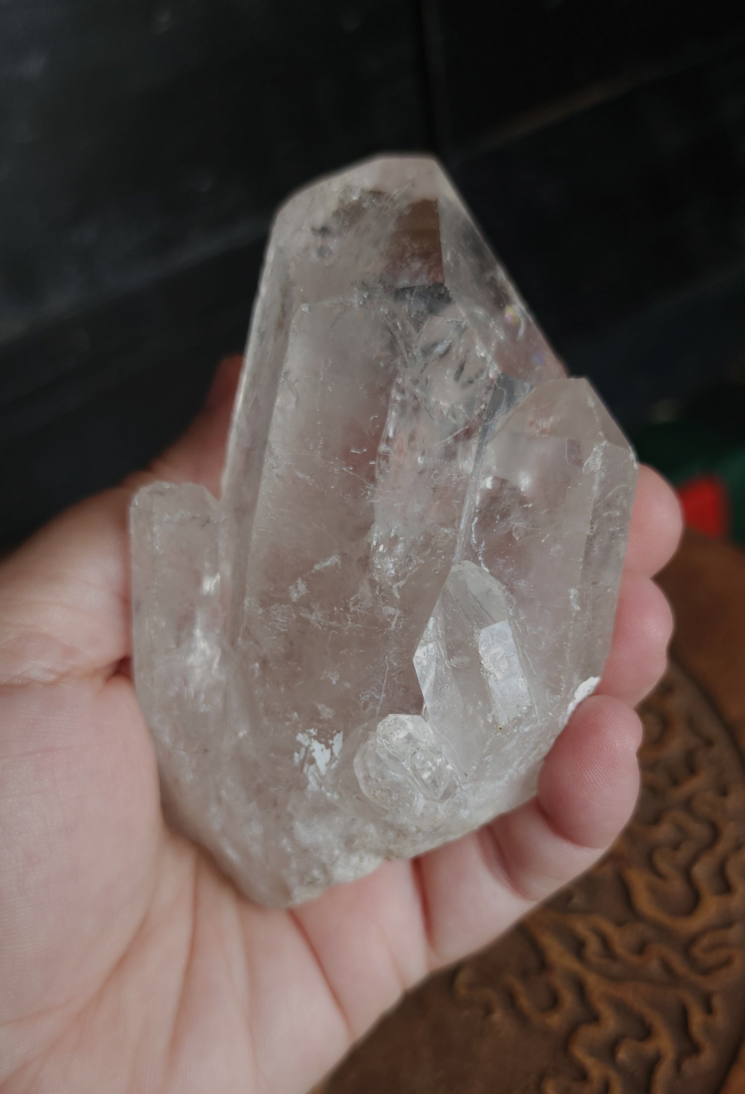 Stunning natural Brazilian clear quartz cluster with rainbows. Includes metal stand for display.