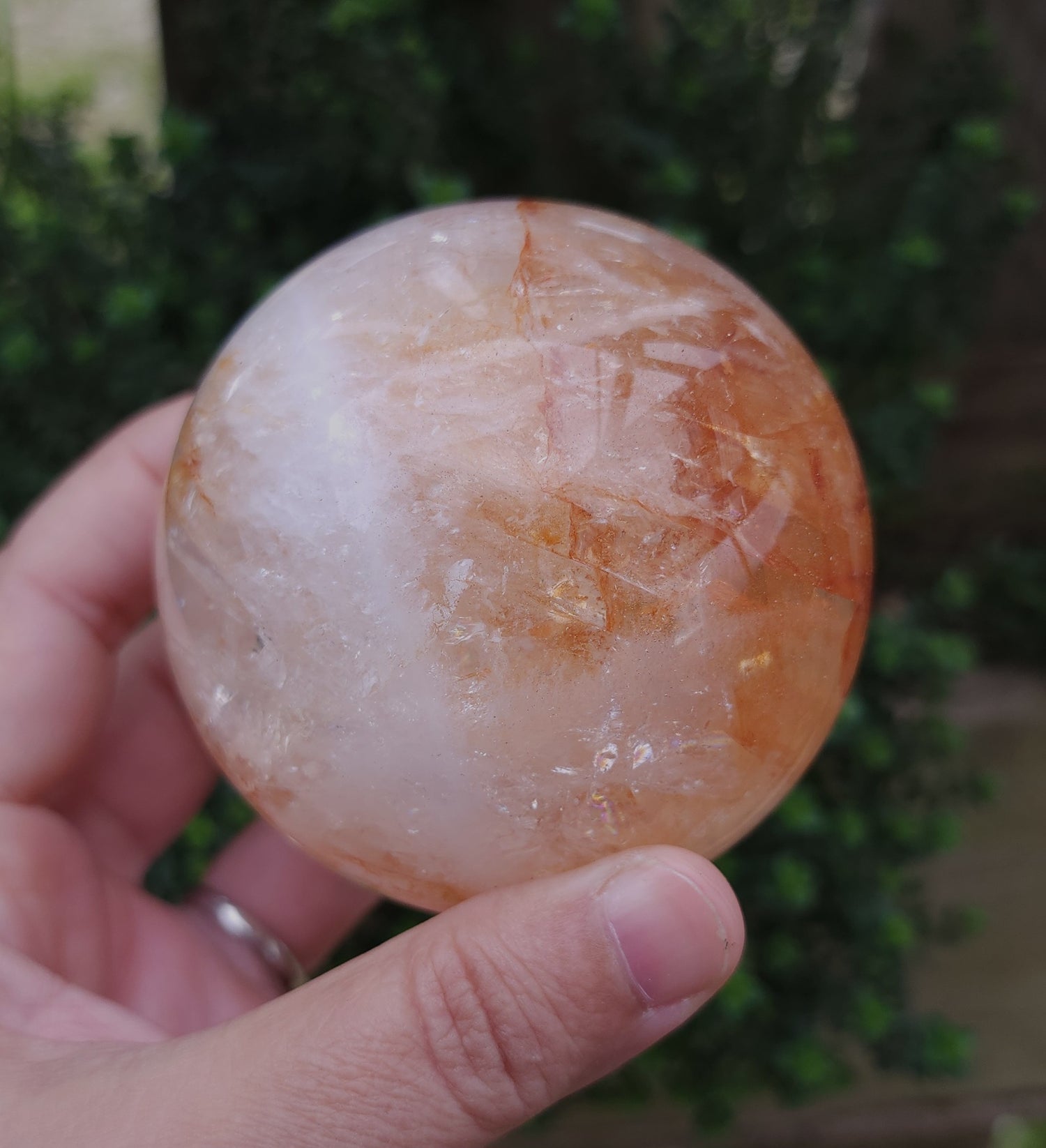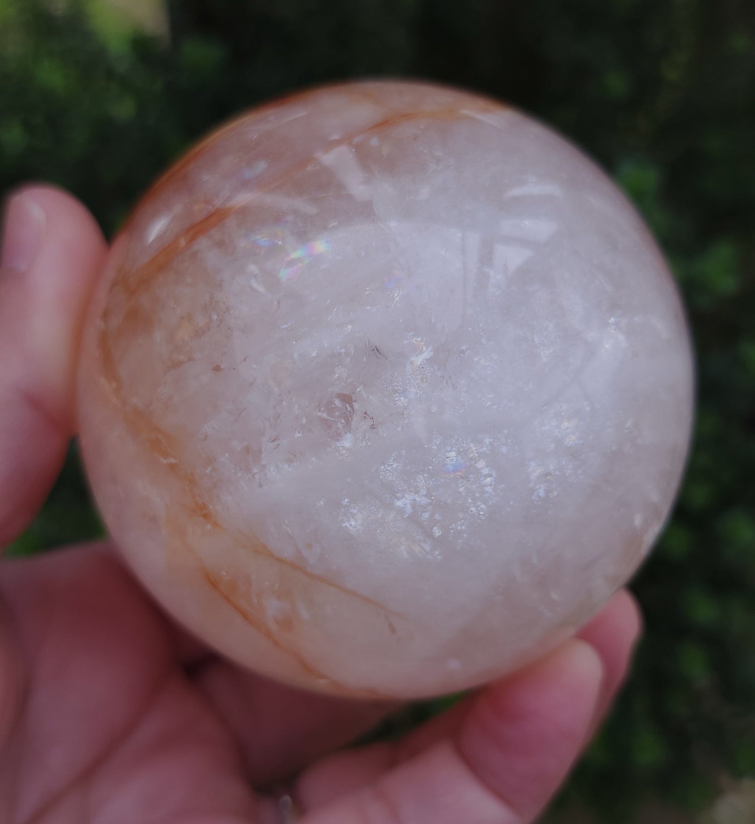 Stunning fire quartz sphere (quartz with hematoid inclusions). Filled with rainbows and a sparkly/iridescent chatoyant effect in the white quartz.