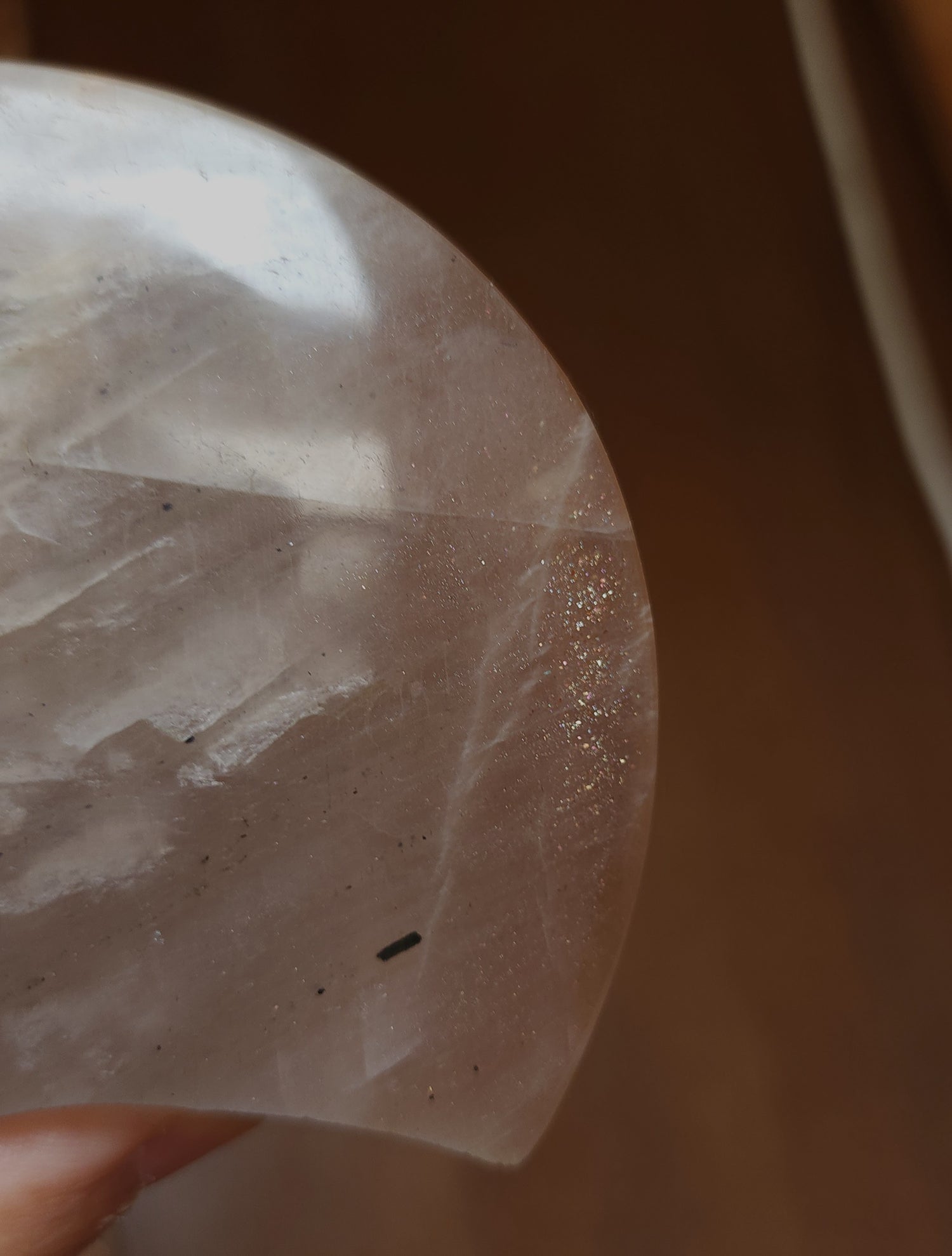 A gorgeous flashy moonstone with a sprinkle of hematite with rainbow aventurescence and black rutile.