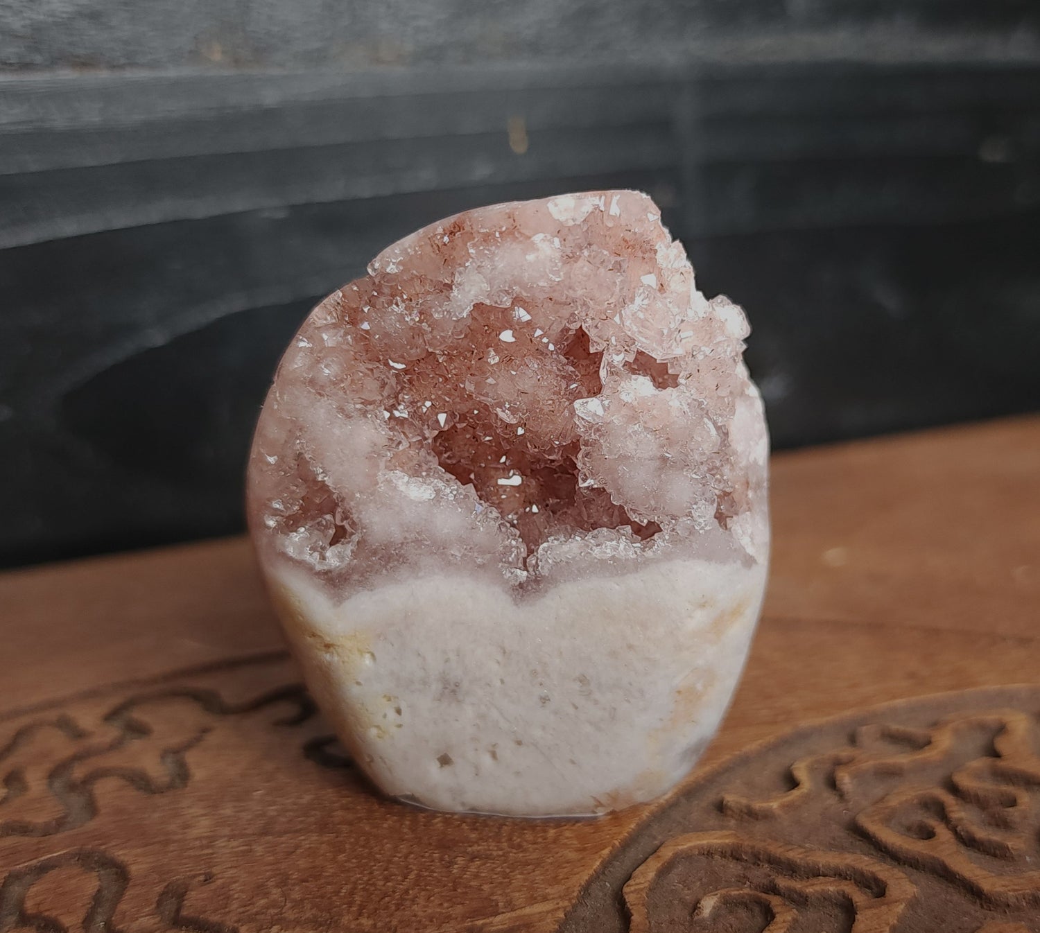 Stunning Brazilian pink amethyst polished freeform with lots of sparkling druzy. Cut base. Can stand on its own.