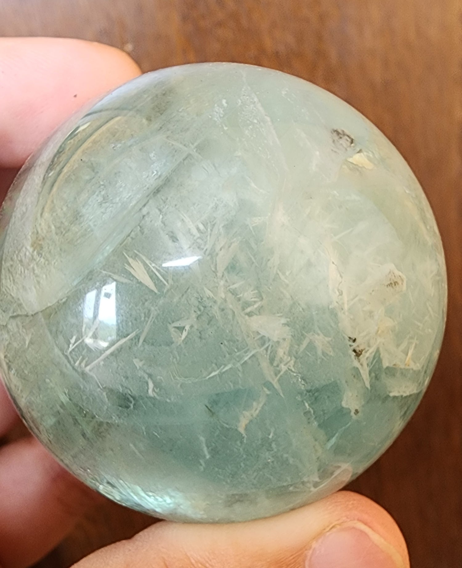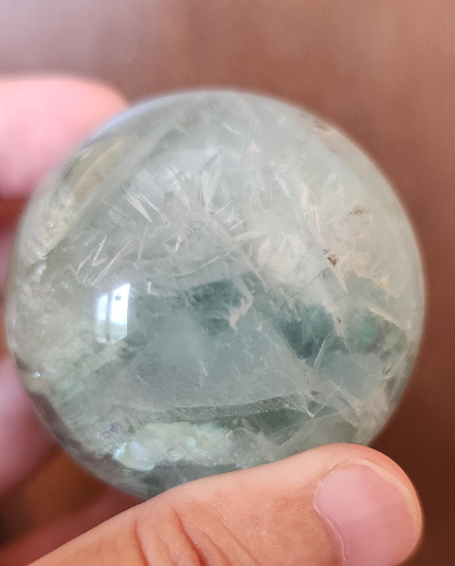 Rainbow filled green fluorite sphere with scolecite "angel feather" inclusions.