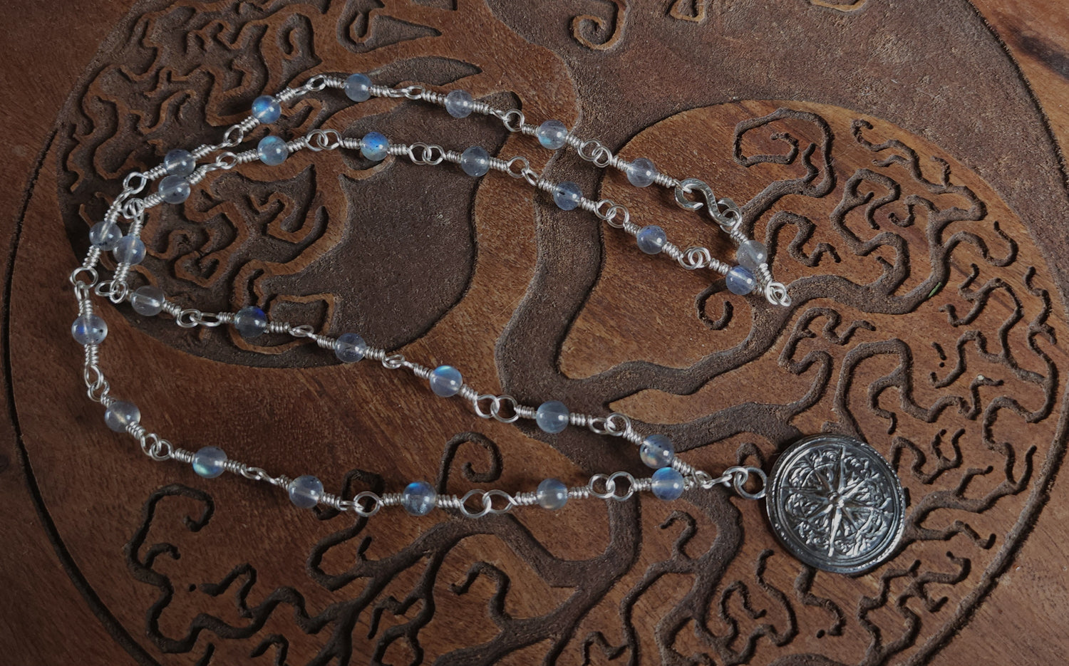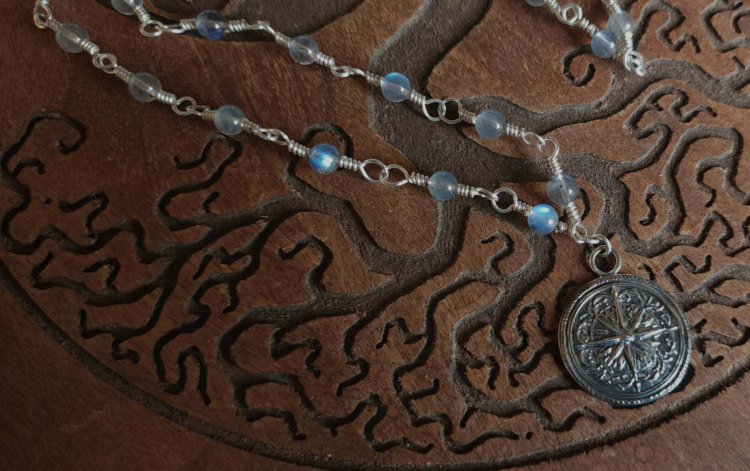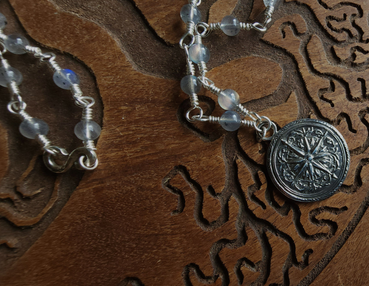 A beautiful ornate compass rose hand pressed in solid sterling silver on a handcrafted chain. Chain is silver plated tarnish resistant with labradorite and a sterling silver hook closure.